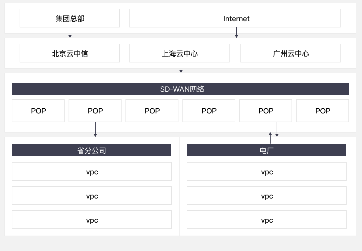 将多级分支结构上网流量做流量归集,统一划分多个云中心访问互联网,且各个云中心分管各自片区,互为备份